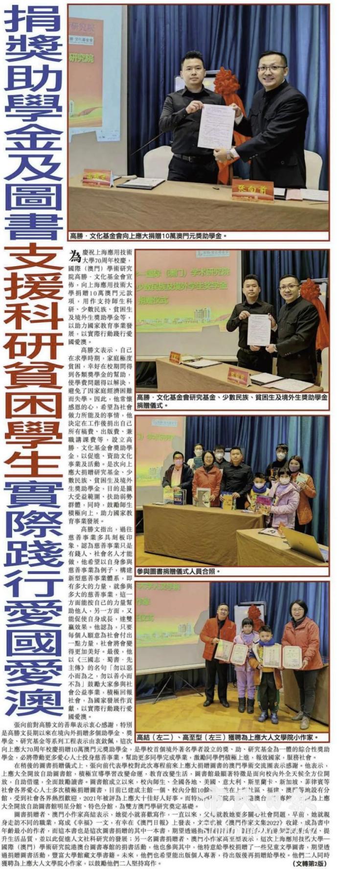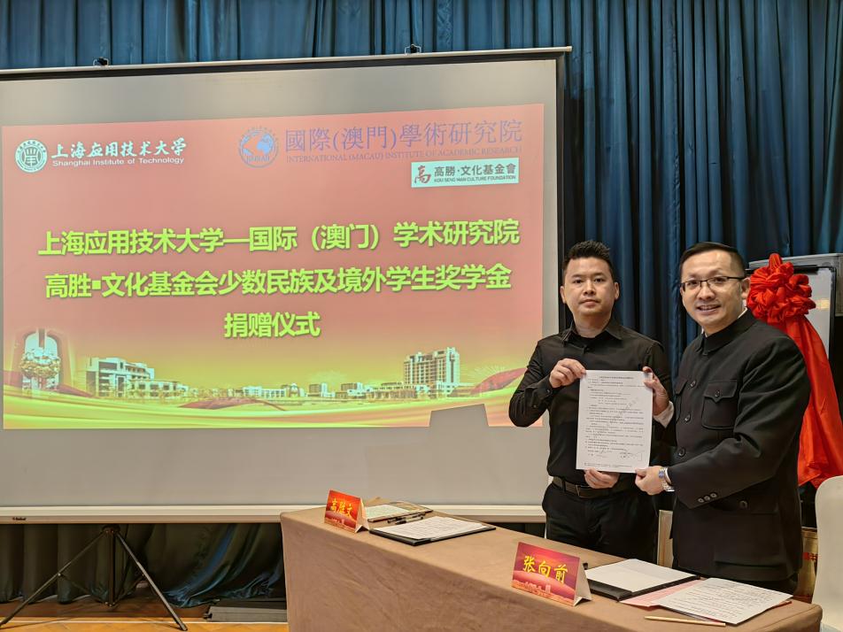 为庆祝上海应用技术大学70周年校庆,国际学术研究院高胜.文化基金会宣佈,向上海应用技术大学捐赠10万澳门元款项,用作支持师生科研、少数民族、贫困生及境外生奖助学金等,以助力国家教育事业发展,以实际行动践行爱国爱澳。