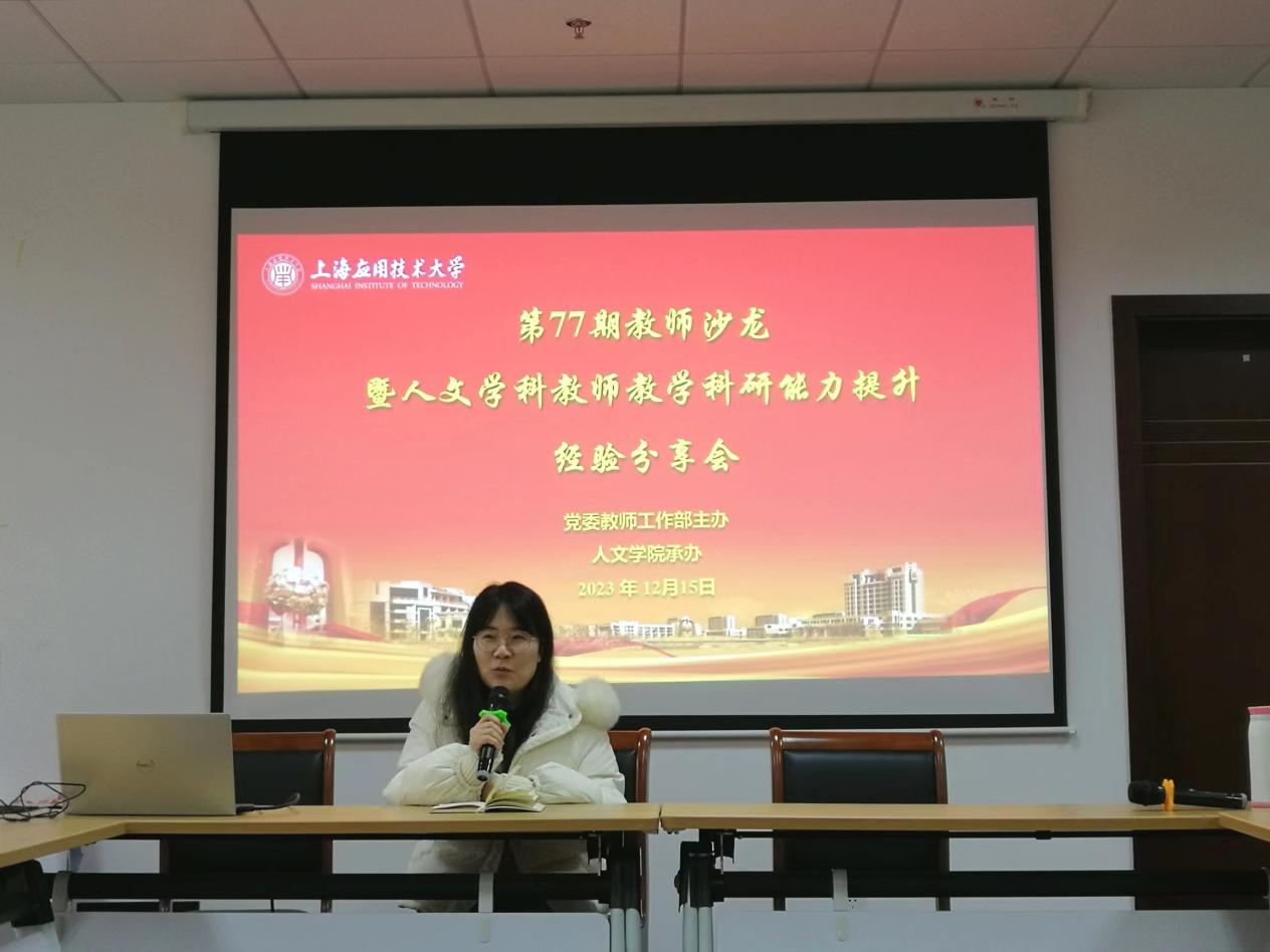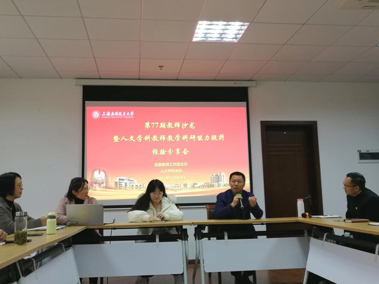 为进一步提高青年教师的教学科研能力与水平,12月15日,人文学院举办第77期教师沙龙暨人文学科教师教学科研能力提升分享会教学沙龙。本次沙龙活动邀请了华东师范大学体育与健康学院博士生导师、教育部全国高校健康教学指导委员会委员、上海应用技术大学体育教育部主任尹小俭教授,2023年全国高校外语课程思政教学案例大赛特等奖获得者、外国语学院公共外语教研一部主任迟娟老师,第三届上海市高校教师教学创新大赛一等奖获得者、人文学院劳动与社会保障系副主任徐小言老师。沙龙活动由人文学院党总支书记周文主持,人文学院全体教师参加本次活动。