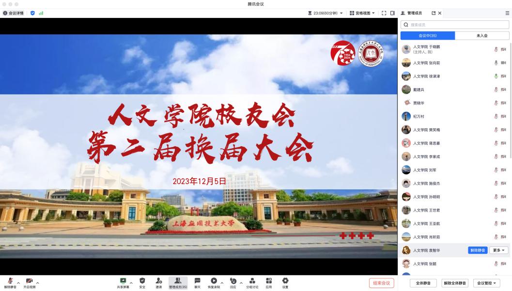 笃信前行,思源致远。2023年12月5日,人文学院校友会举行换届大会暨第二届理事会第一次会议。人文学院党总支书记周文,人文学院院长张向前,人文学院校友会换届筹备工作领导小组成员、学院纪委委员、第一届理事会成员、校友代表、教师代表、学生代表共计36人出席会议。会议由人文学院党总支副书记、副院长徐津津主持。