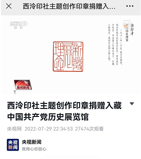 7月29日,央视综合频道《晚间新闻》报道了“西泠印社主题创作印章捐赠入藏中国共产党历史展览馆”。此次共三十六件印章作品入藏党史展览馆,人文学院唐存才老师设计的“新发展理念”朱文篆刻作品荣列其中,被中国共产党党史馆展览收藏。