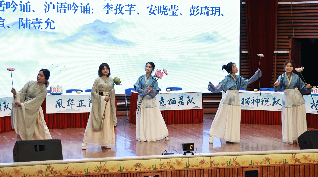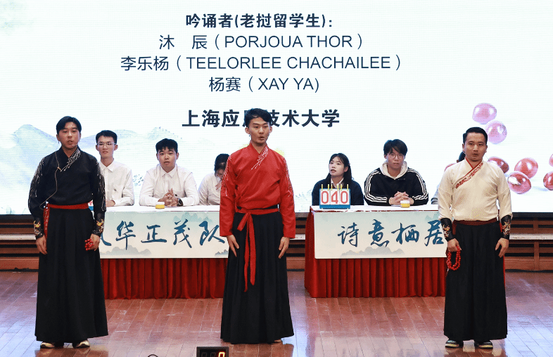 紧张的比赛之余,中场节目也为同学们带来精彩纷呈的视听盛宴。沪语吟诵《江南》以吴侬软语浅吟低唱,将古典诗词融于江南水韵。节目通过声音的起承转合,勾勒出一幅水墨长卷,让听众在抑扬顿挫间感受千年文脉,唤醒深植于方言中的文化记忆与江南情致;老挝留学生带来诵读《相思》,他们通过对中华传统文化的热爱,引发全场共鸣;上海公安学院的学生代表带来节目《虞美人》将古典词牌的意境与现代音乐旋律交织,带领观众穿越千年,在声画相融中感受那份深沉的故国之思与生命绝响,完成一次文学与音乐的动人对话。