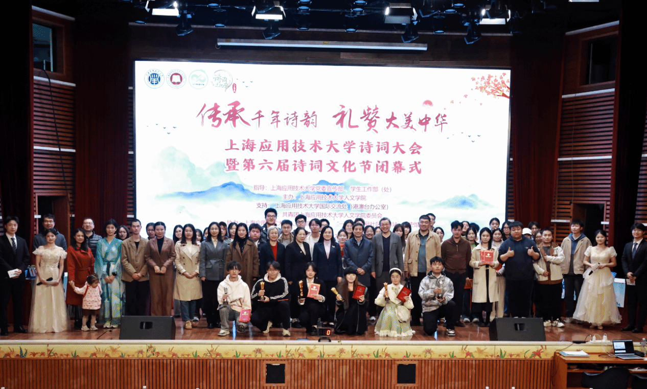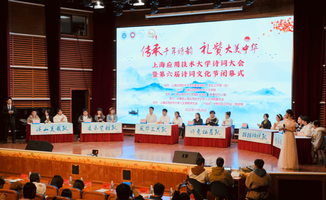 为深入学习习近平新时代中国特色社会主义思想,贯彻落实党的二十届四中全会精神,领悟习近平总书记“激发全民族文化创新创造活力,繁荣发展社会主义文化”的重要论述,11月28日,上海应用技术大学诗词大会暨第六届诗词文化节闭幕式在奉贤校区大学生活动中心小礼堂举办。经过初赛、复赛的层层选拔,18位来自各学院(部)的学子脱颖而出,组成六支代表队,以诗会友、以词竞智,为全场师生奉献了一场融汇古今、情韵交织的文化盛宴。