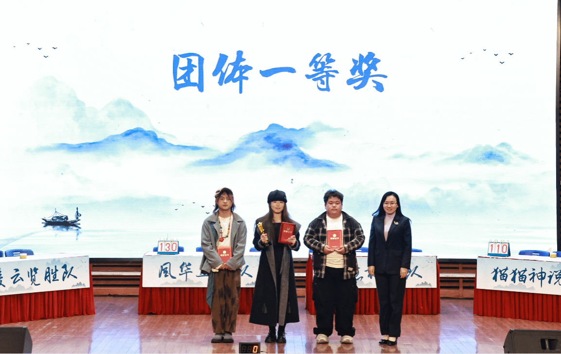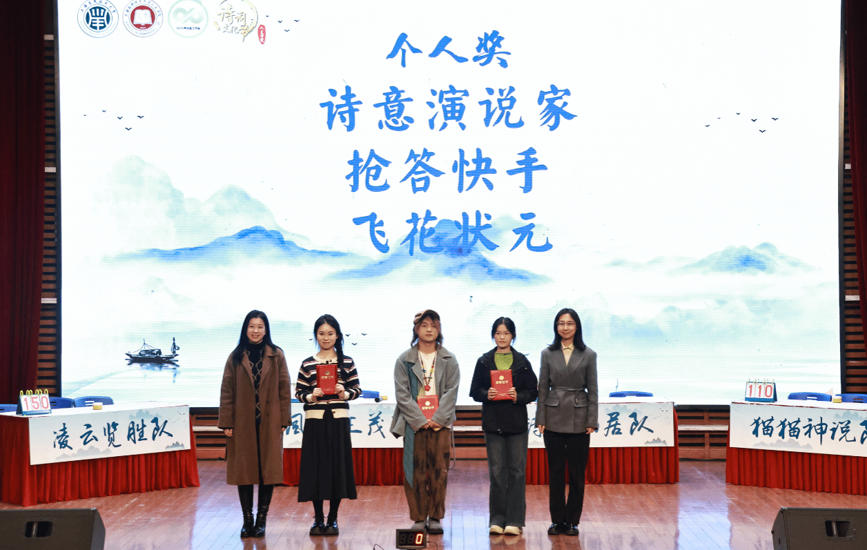 经过激烈的角逐,最终,化工学部王茗萱,人文学院张潇玮,人文学院支毛毛分别斩获本次诗词大会“诗意演说家”、“飞花状元”、“抢答快手”。凌云揽胜队获团体一等奖,风华正茂队、挂席拾月队获团体二等奖,溪山美哉队,诗意栖居队,猫猫神说队获团体三等奖。参加比赛的领导和嘉宾为获奖个人和团队颁发荣誉证书。