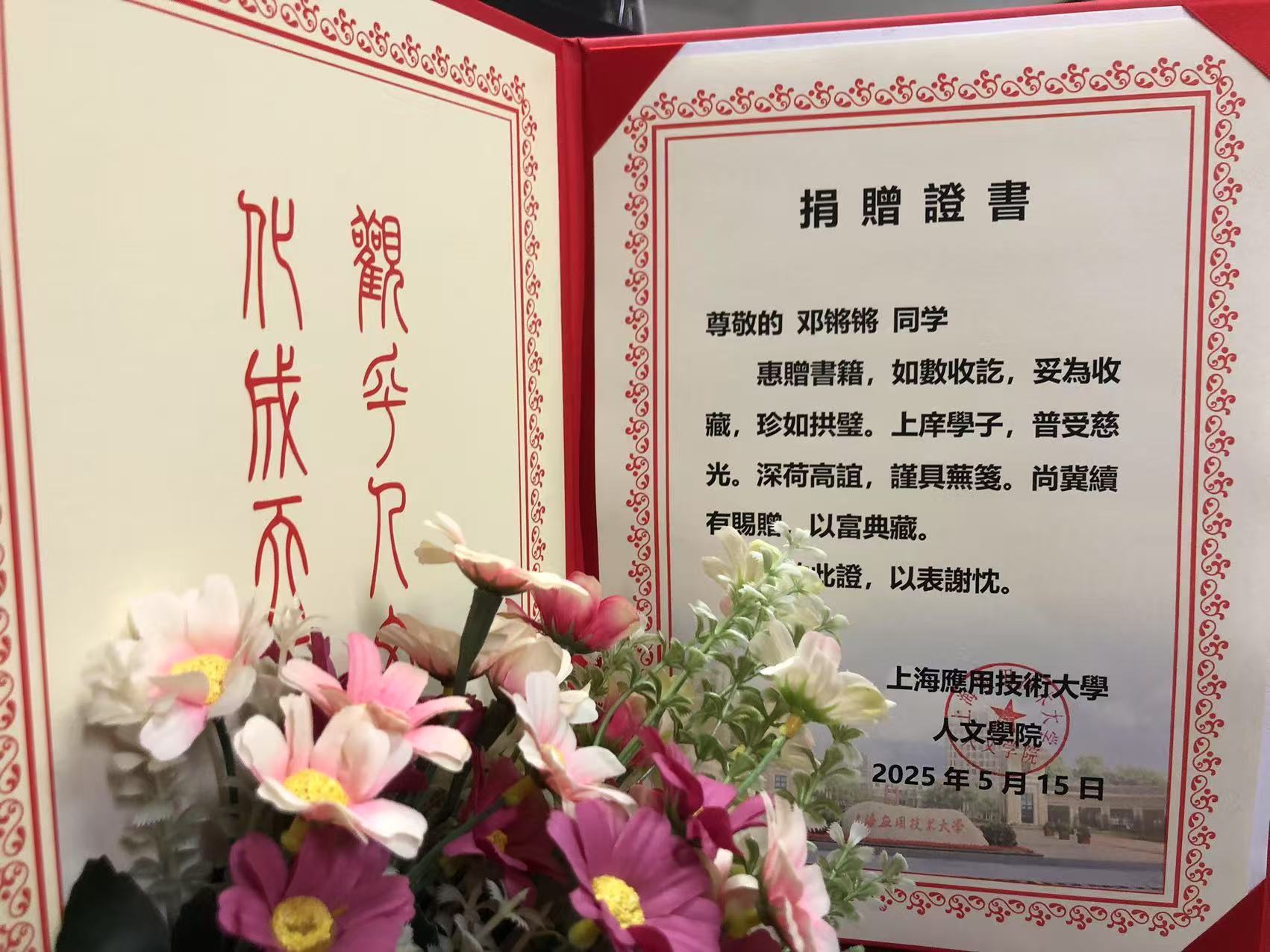 为更好提升人文素养,践行新文科卓越人才培养目标,人文学院积极建设全开放自助图书馆,面向校内外开放。邓锵锵同学积极响应学院倡议,向全开放自助图书馆捐书一箱并寄送学院。邓锵锵同学向学院全开放自助图书馆建设表达美好祝愿,希望更多人通过学习改变命运,读书提升生活,也希望以此鼓励更多人关注、参与社会公益事业。