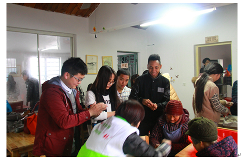 当日,师生们赶到睦邻点随即加入热闹纷呈的“包汤圆”环节。在阿姨奶奶们的亲切指导下试着动手包汤圆。临近中午,师生们将刚出锅热腾腾的汤圆送至村里几户有困难的老人家中。在这个春寒料峭、丝雨绵绵的日子将温暖传递开来。中午大家和老人们一起吃元宵。品尝元宵后,师生与老人们结对子,组团挑战当日的“猜灯谜”游戏。当天,我校一名来自非洲的留学生也加入到送温暖的志愿者中。他当天学做元宵、送元宵,到老人家中帮忙贴春联,互动中他还用中文为老人们深情献唱一曲《当你老了》,现场观众皆为之动容。当天整个睦邻点都沉浸在祥和热闹的节日气氛中。