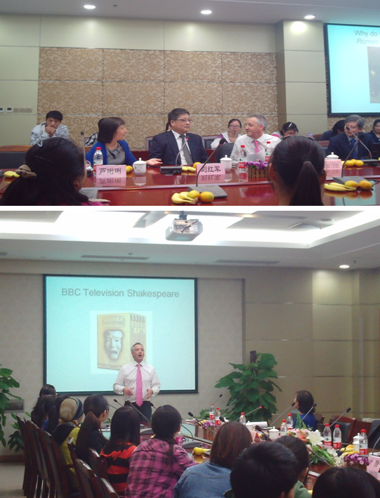 讲座伊始,刘红军院长隆重介绍了西恩·霍姆斯博士和郭明智先生,并对他们的到来表示热烈的欢迎。随后,西恩·霍姆斯博士开始了他精彩的讲座。他以莎士比亚的经典名著《罗密欧与朱丽叶》的故事本身入手,通过对不同年代的同一主题电影《罗密欧与朱丽叶》进行对比来说明为什么我们仍然深受着罗密欧与朱丽叶。讲座中,西恩·霍姆斯博士利用了丰富的文字和视频资料为大家呈现了《罗密欧与朱丽叶》这一伟大的爱情故事,令人耳目一新。最后,讲座在雷鸣般的掌声中圆满结束。