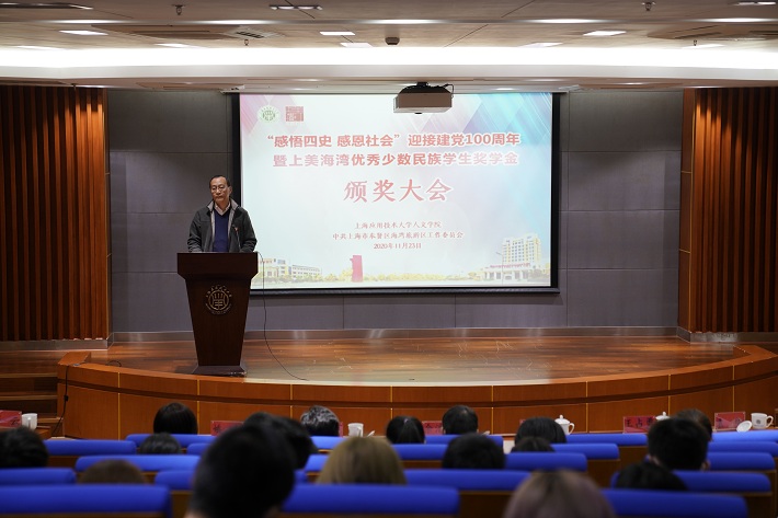 11月23日下午,人文学院举办“感悟四史,感恩社会”迎接建党100周年暨“上美海湾优秀少数民族学生奖学金”颁奖大会。校党委副书记、纪委书记何星海出席并致辞,奉贤区委统战部副部长、民宗办主任余浩洁,海湾旅游区党工委书记李秋弟,党工委副书记、管委会主任姚红、我校党委学工部部长、学生处处长袁翔,校党委组织部、统战部副部长于有进,人文学院院长刘红军,党总支书记周文,党总支副书记、副院长徐津津,人文学院全体辅导员以及全体少数民族同学,150余人参加此次大会。