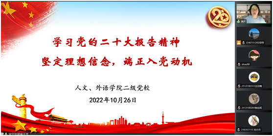 2022年10月26日,上海应用技术大学党校人文、外国语学院第44期分党校开学典礼在线上腾讯会议举行。人文学院党总支书记、分党校校长周文、副书记徐津津,外国语学院党总支书记、分党校校长李晓晶、副书记金丽华参加此次开班典礼。会议由党总支副书徐津津主持,来自人文学院和外国语学院的近40名学员参加了本次开学典礼。