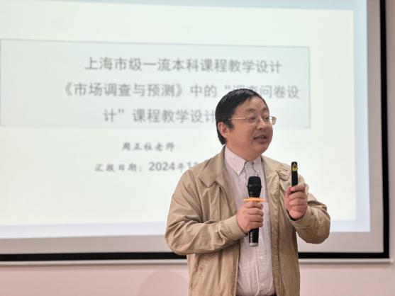 周正柱教授以“上海市一流本科课程教学设计《市场调查与预测》中的调查问卷设计课程教学设计”为题从课堂设计、内容组织、教学形式、科研融入、课后思考等方面,全面介绍了“精雕细琢一堂课”的全过程,可以说是集“编、导、演”于一身,设计好台词剧本,做好教案设计并强调了课程互动的重要性。