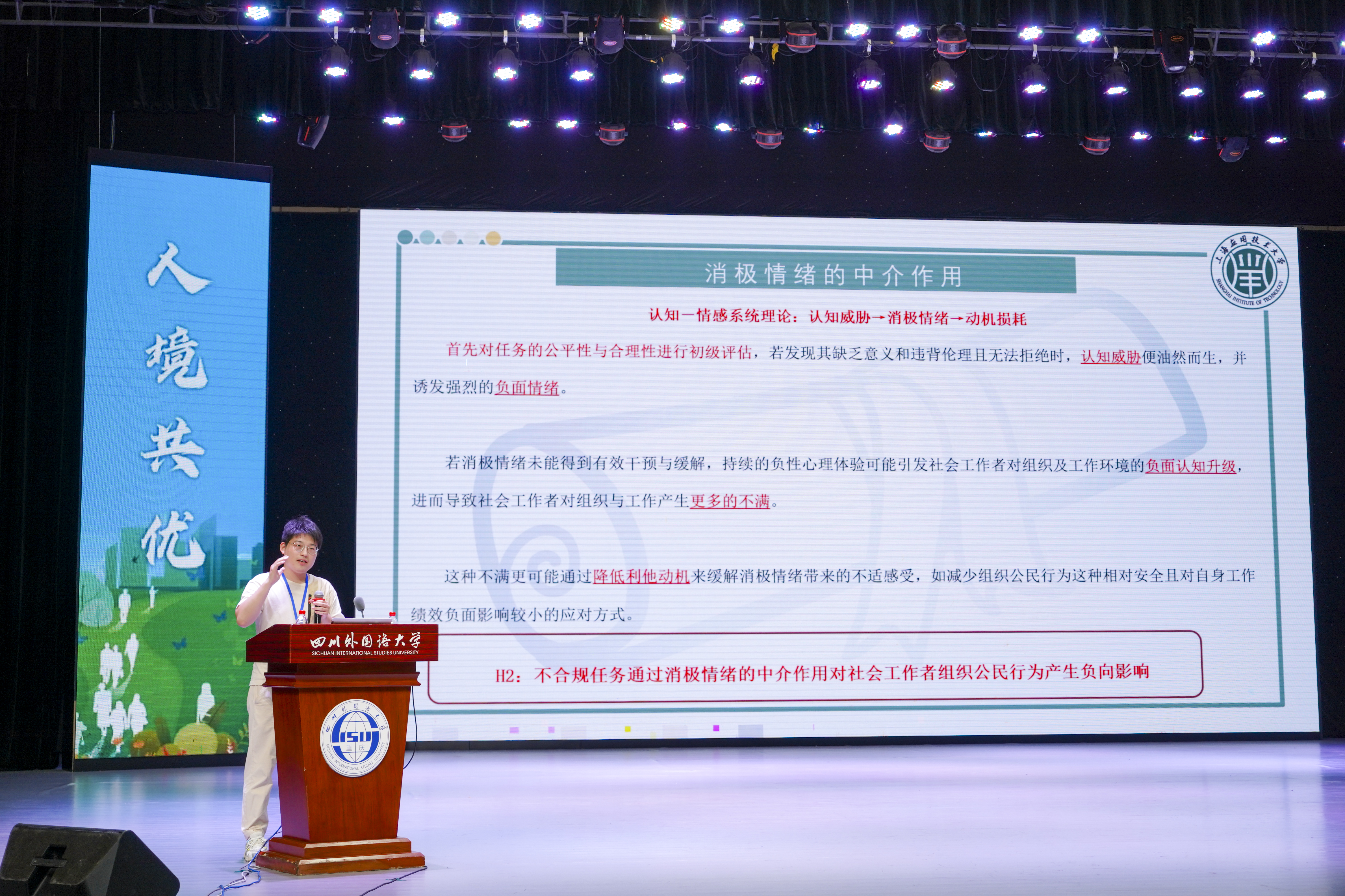 由李正东教授指导的23级MSW研究生王津、张闯,其论文《荣辱与共还是貌合神离?不合规任务对社会工作者组织公民行为影响研究》入选主论坛发言。该研究基于资源保存理论与认知—情感系统理论,揭示了不合规任务对社工组织公民行为的影响机制,并提出了明确岗位职责、监测情绪状态、营造关怀型组织氛围等实践建议,为行业管理提供了重要参考,最终荣获二等奖。由严骏夫老师指导的24级MSW研究生王雨在分论坛汇报论文《独立发展抑或彼此成就?社工-督导专业支持与服务质量的主客体互倚模型分析》,该文聚焦社工与督导的协同效应,创新性引入主客体互倚模型,验证了专业支持对于提升服务质量的主体效应,同时揭示了社工与督导通过影响对方工作情绪实现服务质量的“情感协同”逻辑,最终获三等奖。
