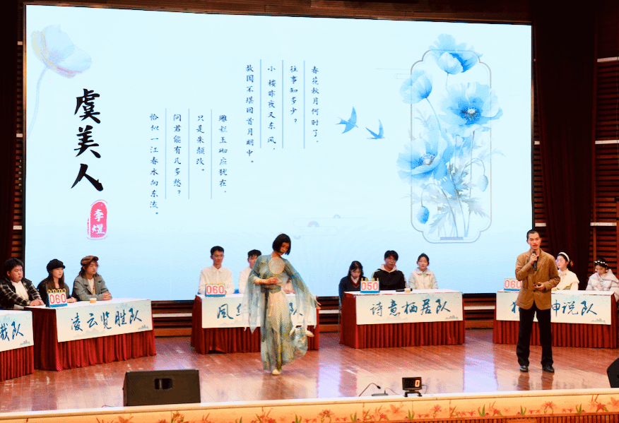 校党委副书记、副校长王瑛,人文学院党委书记周文,院长李正东,校党委宣传部副部长吕客,校团委副书记魏晋,人文学院党委副书记、副院长徐津津,副院长肖昕茹,人文学院团委书记于晓鹏,以及中国诗词大会学术总负责人、命题专家组组长李定广,上海大学研究生院副院长、诗礼文化研究院执行院长姚蓉,上海公安学院基础部专业基础教研室主任崔磊、上海公安学院基础部教师、中国诗词大会第六季总冠军陈曦骏等特邀评审专家,与各学院(部)师生代表及观众一同见证了这场诗意与才华的交锋。