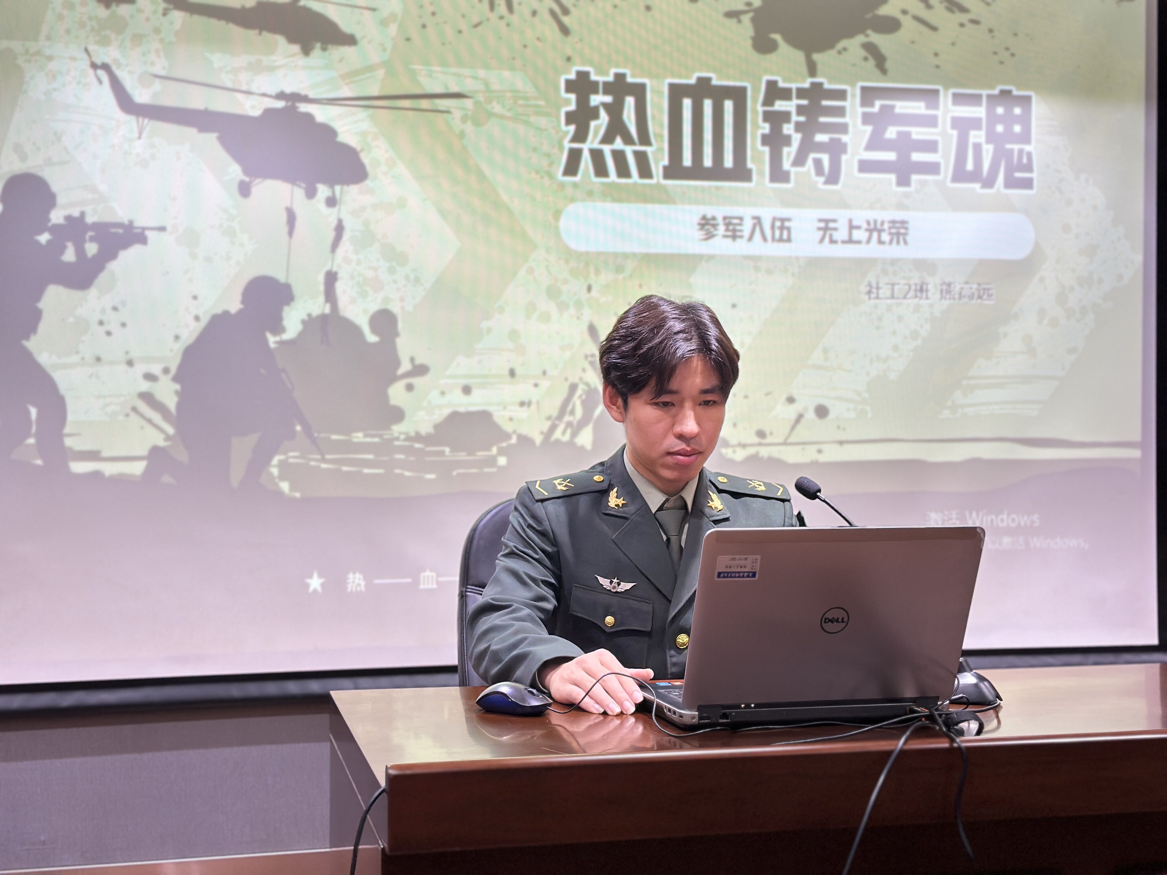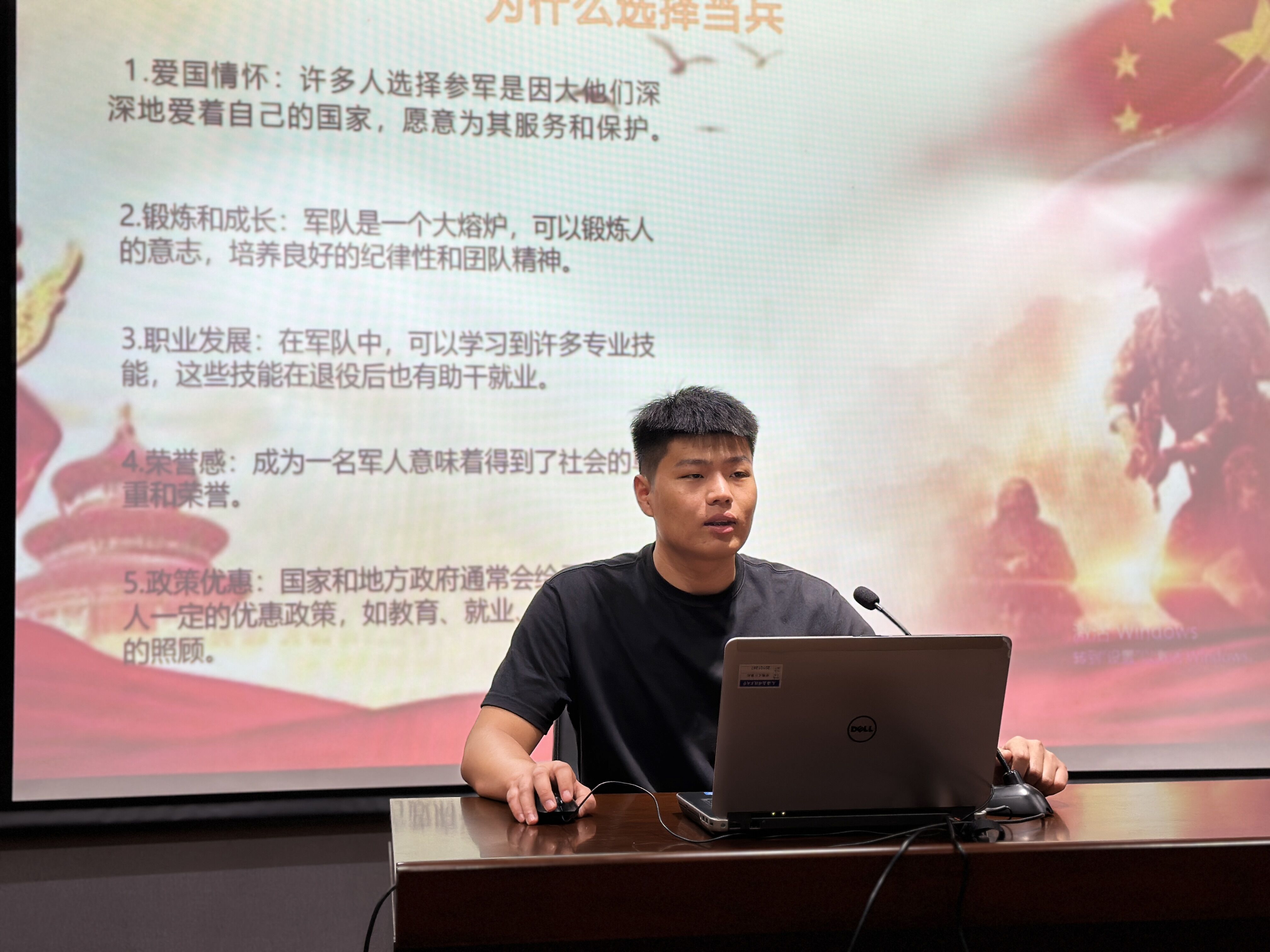 曾服役于中国人民解放军陆军第73集团军某部的战士熊高远不仅为同学们介绍了入伍的意义和流程,同时分享了军队生活的趣事、乐事,激发了同学们对军队生活的向往和憧憬。他说:“青春风华正茂,参军无上光荣”,当兵的岁月是用青春书写壮丽,是生命中最璀璨的华章。