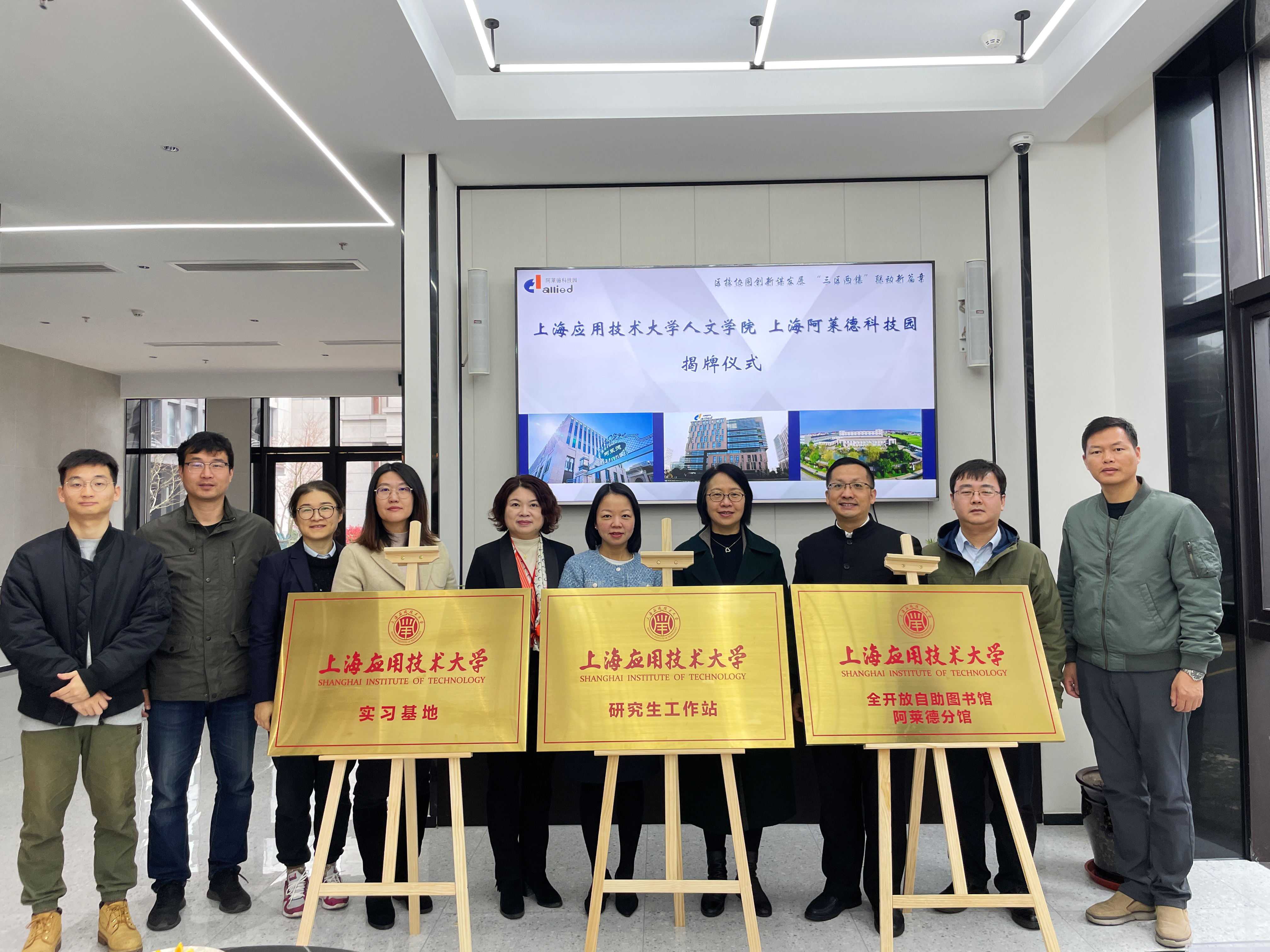 双方共同为“上海应用技术大学研究生工作站”“上海应用技术大学实习基地”和“全开放自助图书馆阿莱德分馆”揭牌,张向前院长代表学院向平珏颁发了“创新创业导师”聘书,学院副院长肖昕茹向平珏颁发了“研究生实践导师”聘书。
