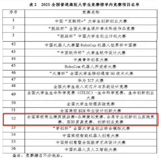 2021全国普通高校大学生竞赛排行榜中显示,全国高校商业精英挑战赛创新创业竞赛再次被纳入排行榜内竞赛项目名单,赛事编号52号(排名不分先后,具体请查看中国高等教育学会官网)。竞赛经过多年培育发展,业已成为我国高等商科教育领域中专业覆盖全面、校企合作深入、国际交流广泛的赛事活动;集学科竞赛、产学合作与国际交流三位一体的创新实践平台。竞赛在我国“十四五”期间再度被纳入全国普通高校大学生竞赛排行榜名录,体现了教育行政主管部门对创新创业竞赛相关领域推动学科建设、产教融合发挥作用的高度认可。