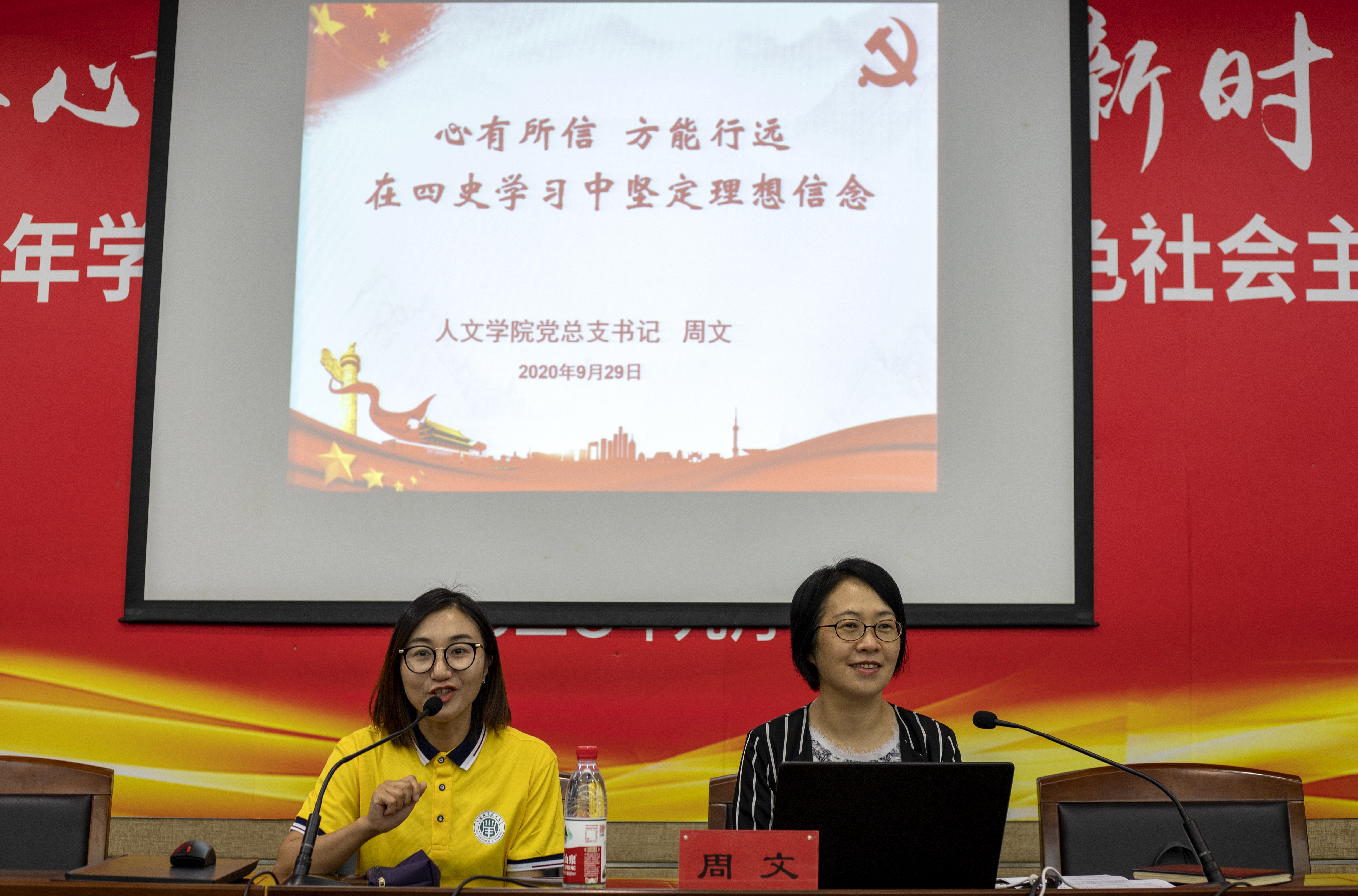 9月29日晚六点,人文学院党总支书记周文,以《心有所信,方能远行,在四史学习中坚定理想信念》为题,在图书馆B101为2020级新生开展《新生思想政治教育讲座》,勉励广大新生“不忘初心,牢记使命”,在“建党一百年“和”建国一百年“之间二十余年中,发光发热,挥洒青春,为中国的伟大事业而奋斗!现场共计200余师生共同聆听学习。