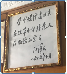 随后,老人带领志愿者们参观了他的书房,书柜里整整齐齐的陈列着《毛泽东文集》,墙上还挂着江泽民的亲笔题词——学习杨怀远同志,在改革中坚持为人民服务的宗旨。他亲自为志愿者们佩戴上他的荣誉奖牌与军帽,耐心地与每一个人合影,可以看得出这位年迈的老人将自己一心为人民服务的心意托付给了年轻的一代。