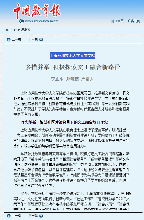 上海应用技术大学人文学院积极响应国家号召,推进新文科建设,将文科教育与工程技术教育深度融合,探索智慧社区建设背景下文工融合的新路径。通过跨学科合作、创新教育模式与执行社会实践项目等一系列创新实践举措,不仅提升了学院的办学特色,也为新时代复合型人才培养和社会服务提供了有力支撑。