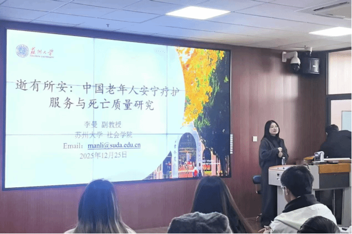 首场活动特邀苏州大学社会学院劳动与社会保障系李曼副教授主讲“中国老年人安宁疗护服务与死亡质量研究”。李曼副教授从辨析“安宁疗护”“临终关怀”和“安乐死”等核心概念入手,通过翔实的数据和案例分析,系统阐述了中国安宁疗护政策试点成效。李教授团队基于对全国29个试点城市的跟踪研究,构建了高龄老人死亡质量指数(QODI),为评估安宁疗护服务效果提供了科学工具。她还特别分享了学术研究方法,指导学生如何将实务问题转化为可研究的学术课题。