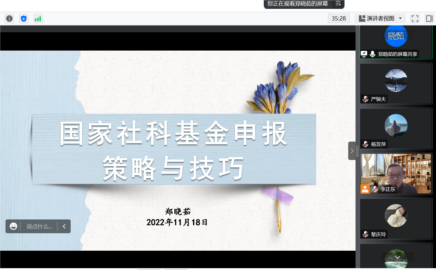 2022年11月18日晚上19:00-21:00,人文学院以线上形式组织开展课题申报经验交流会暨2023年课题申报启动会,人文学院副院长李正东主持本场会议,会议吸引了院内外30余位老师参加。